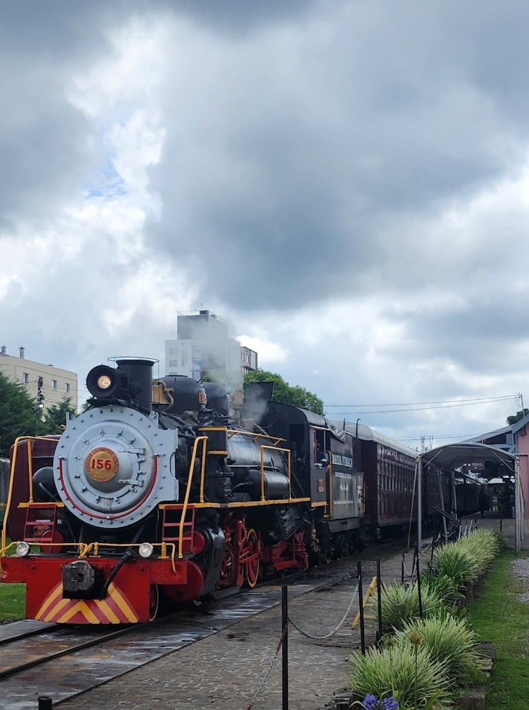 Locomotiva histórica com paradas culturais, degustações e charme típico da serra.